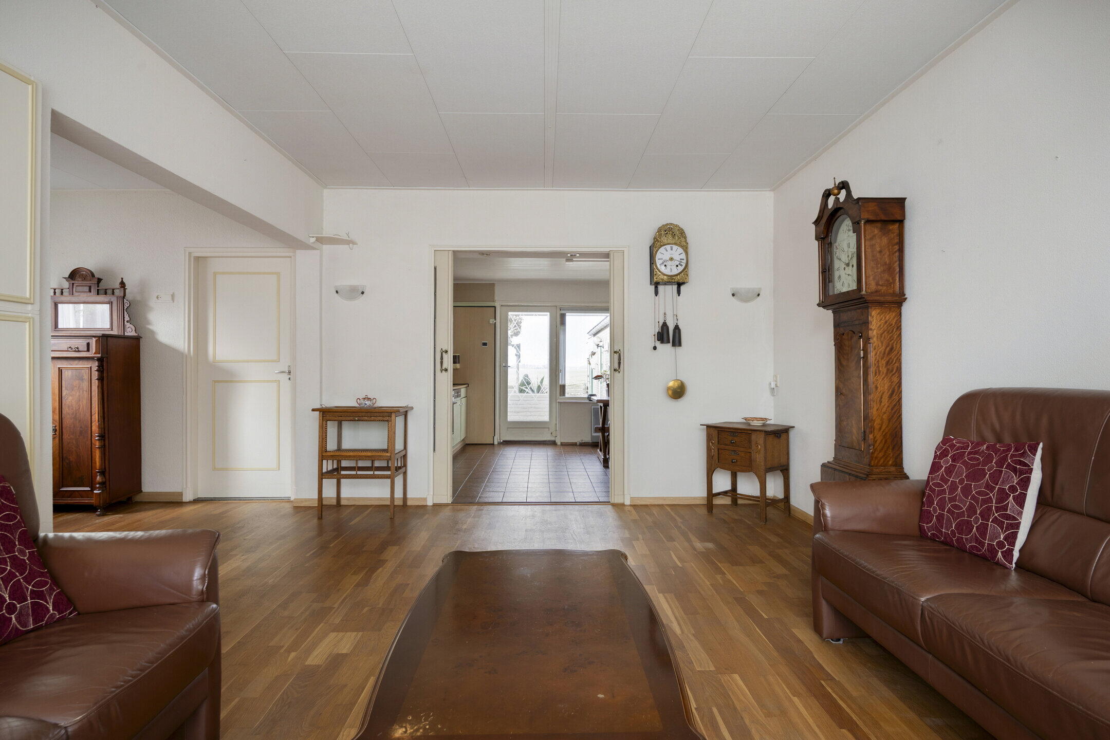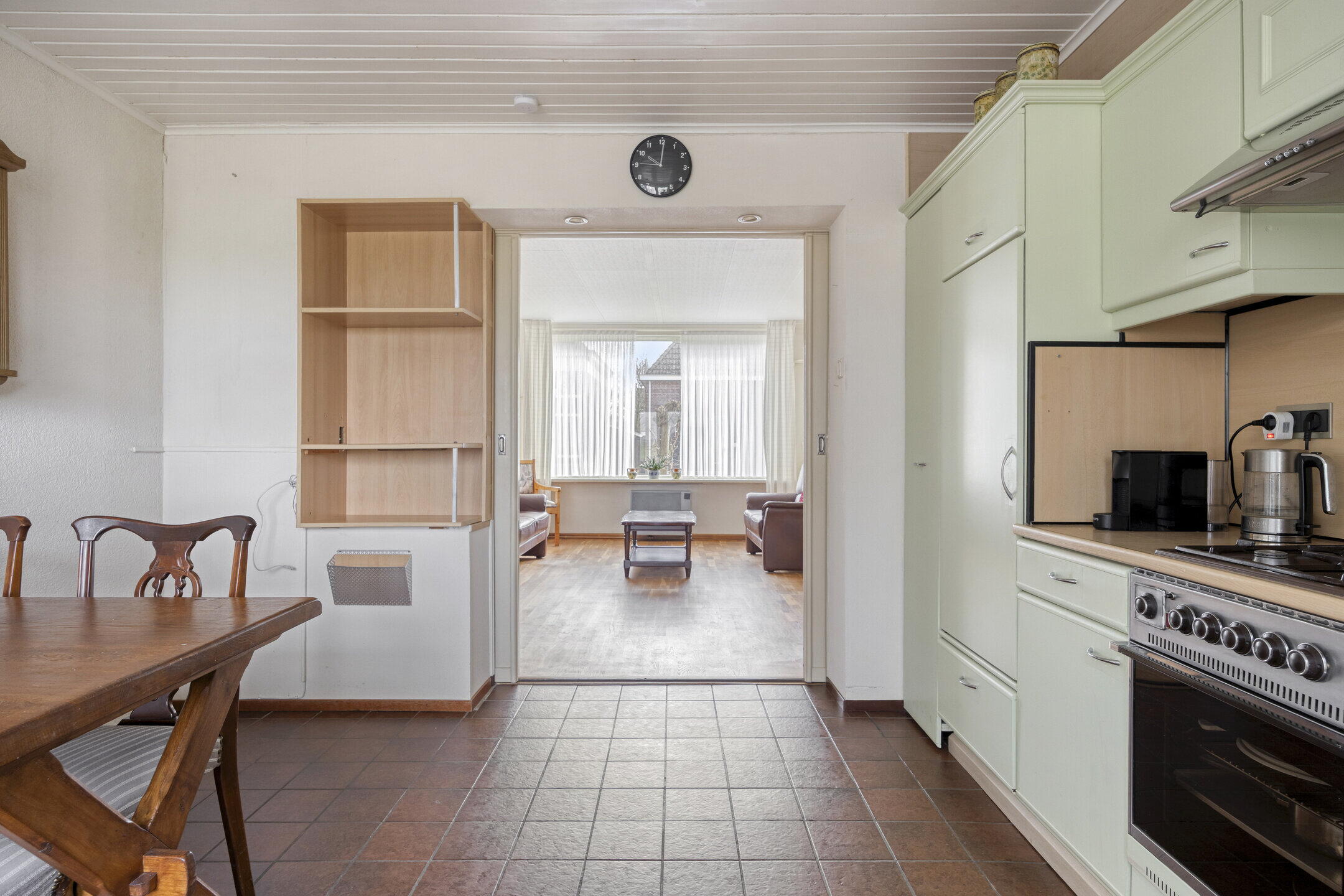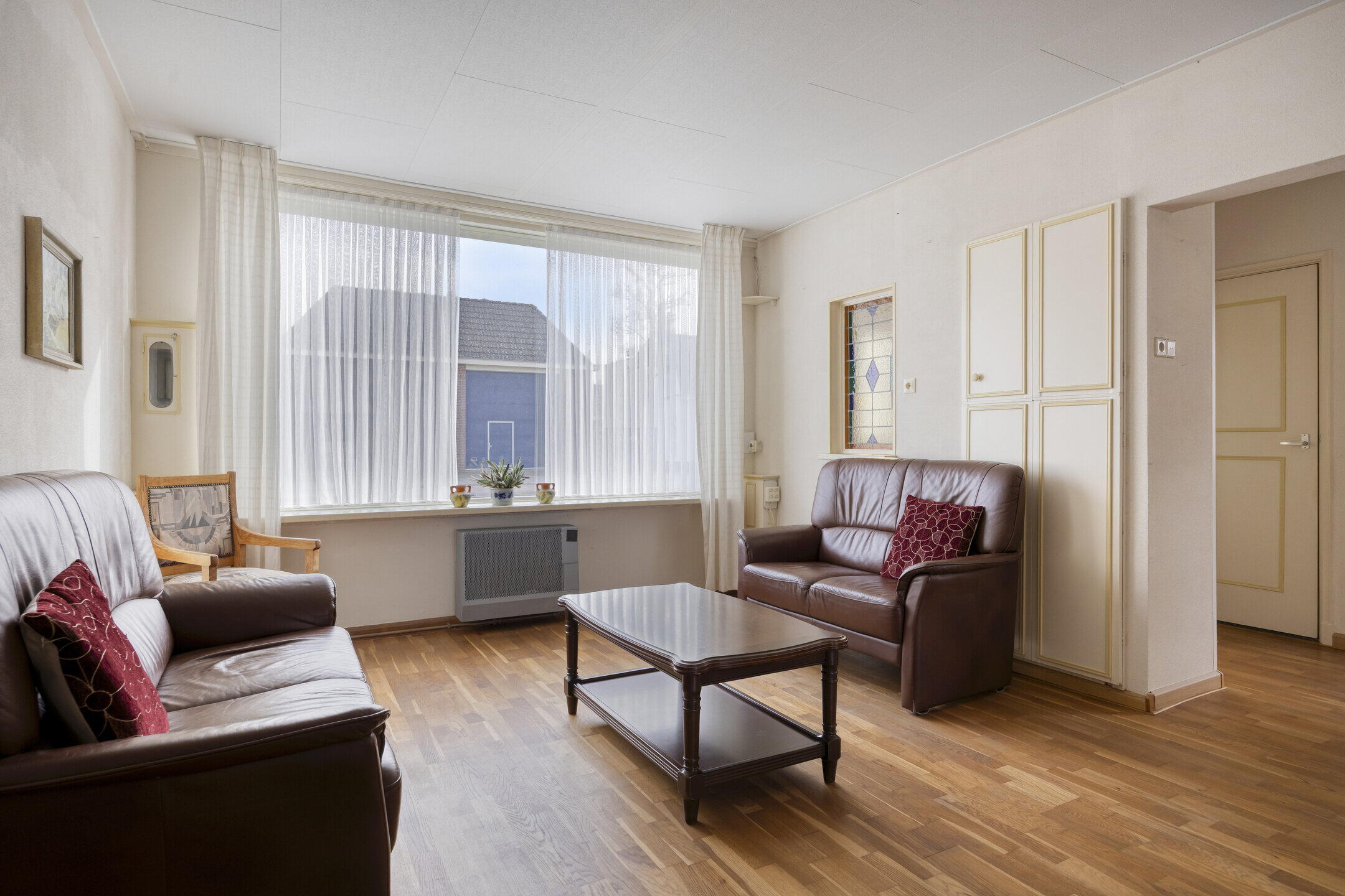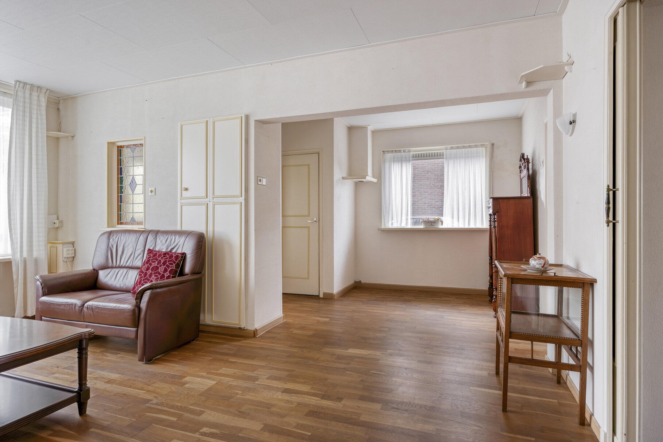 Bij binnenkomst valt direct op hoeveel ruimte de woning biedt. Links bevindt zich een handige provisieruimte voor extra opslag. De woonkamer is royaal en biedt volop mogelijkheden voor het creëren van een gezellige zithoek. Dankzij de grote ramen met glas-in-looddetails komt er veel natuurlijk licht binnen en krijgt de ruimte een sfeervolle en karaktervolle uitstraling. Via schuifdeuren bereik je de ruime keuken. Dit is een fijne plek waar je nog alle kanten mee op kunt. De keuken is netjes en ruim genoeg om hier ook een grote eettafel te plaatsen, zodat je hier heerlijk kunt dineren met familie en vrienden. Aansluitend vind je een kleine serre, wat zorgt voor extra licht en een fijne overgang naar buiten. Naast de keuken bevindt zich een praktische bijkeuken, ideaal voor het opbergen van spullen. Vanuit hier bereik je ook een gang met een separaat toilet.
