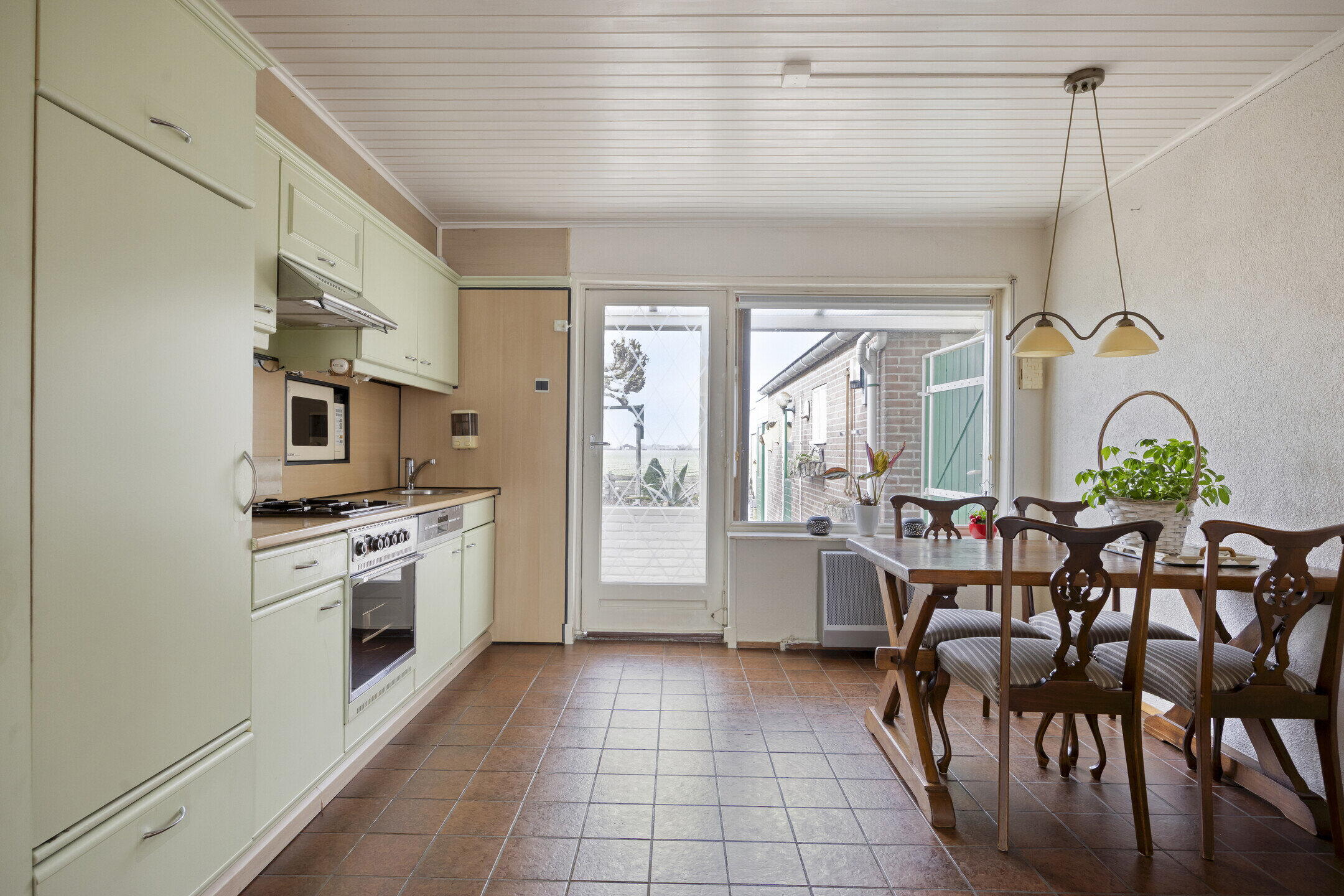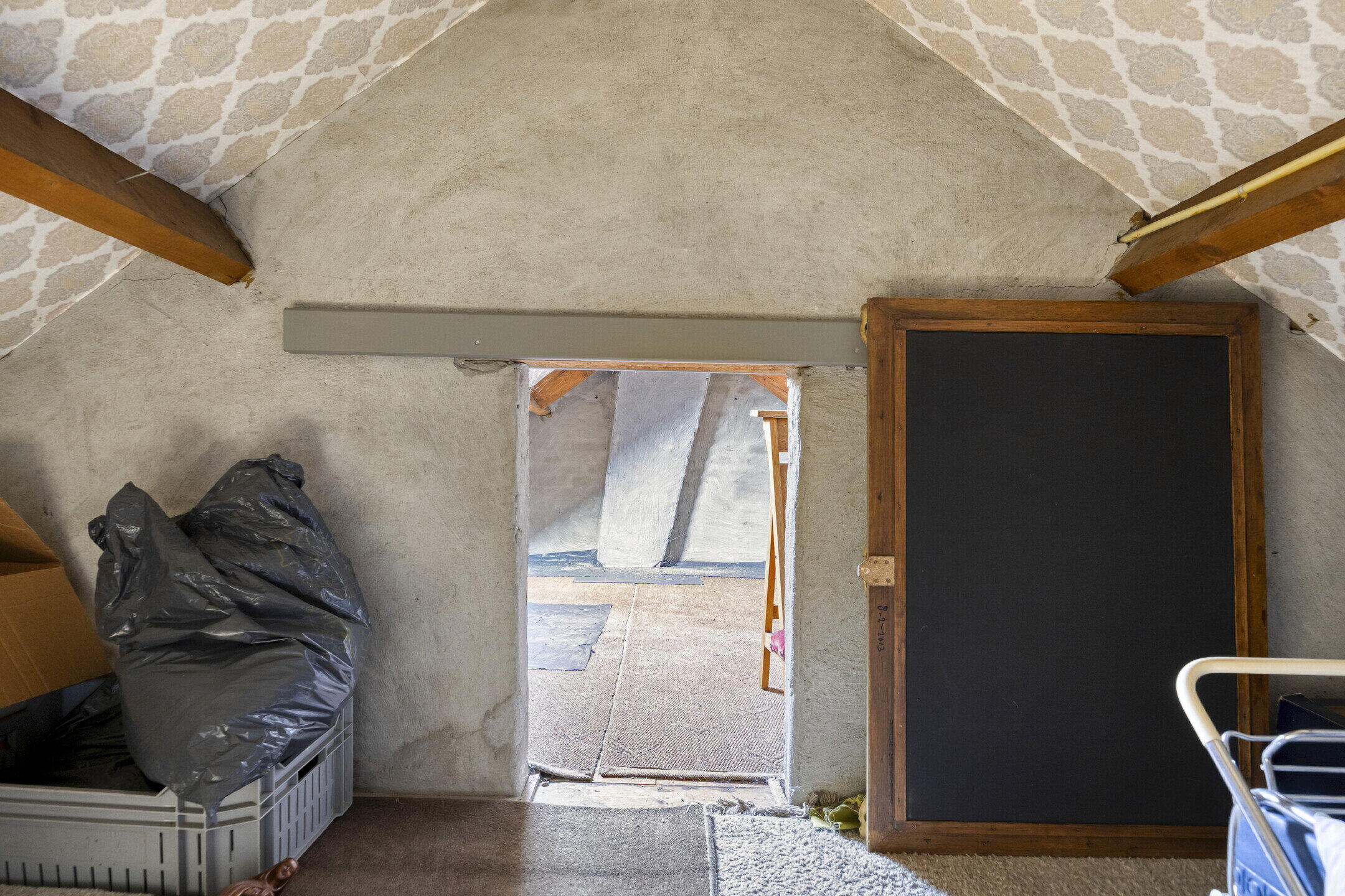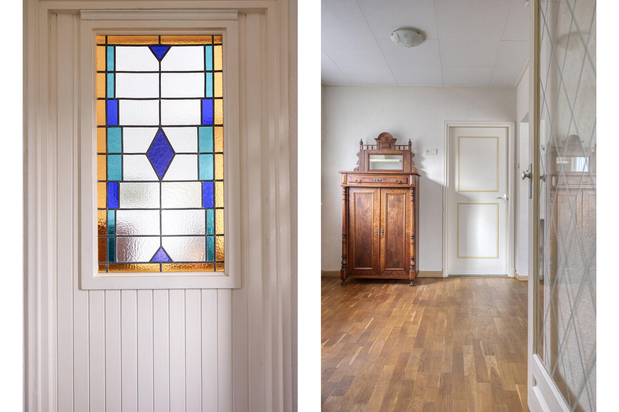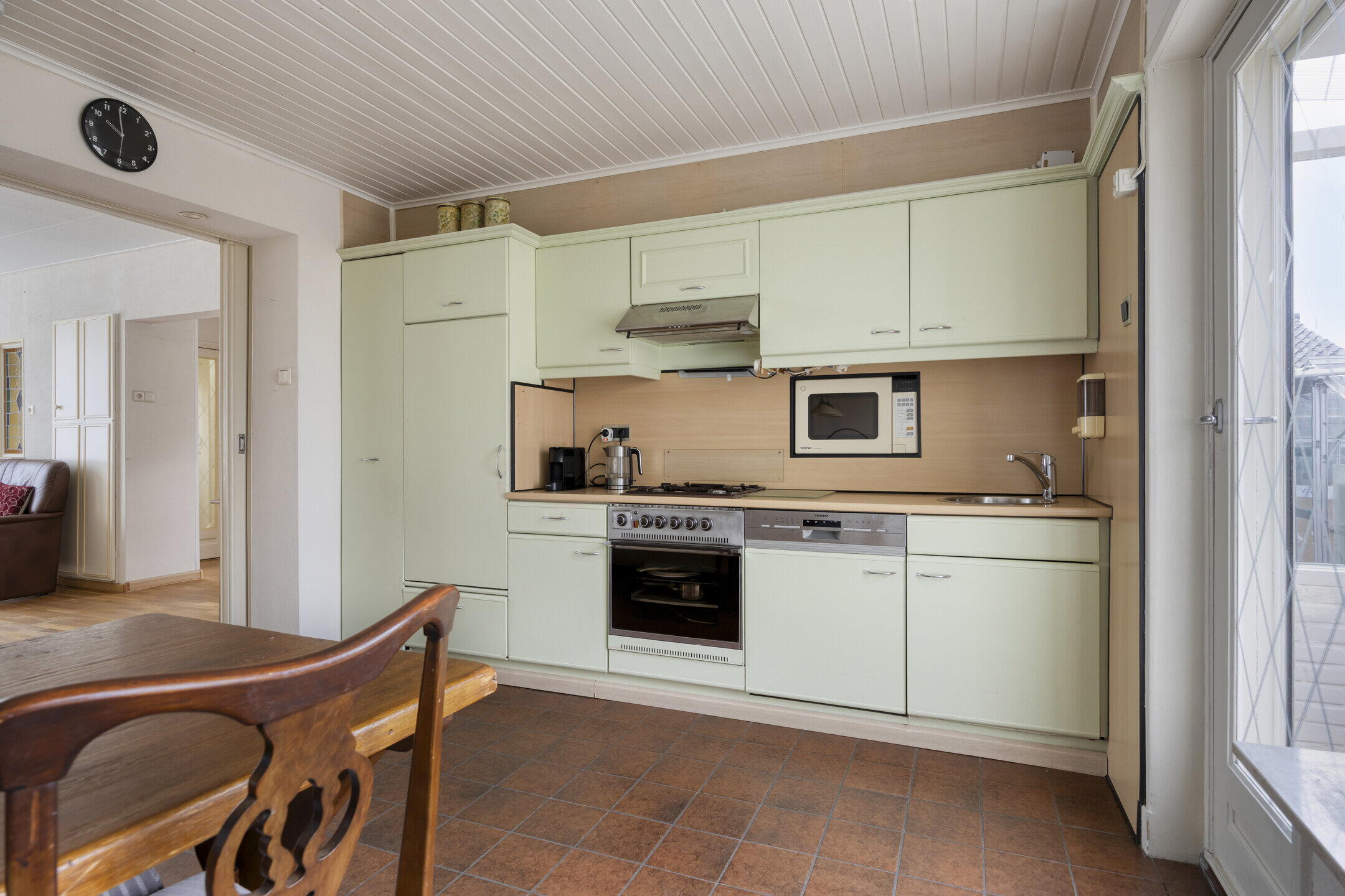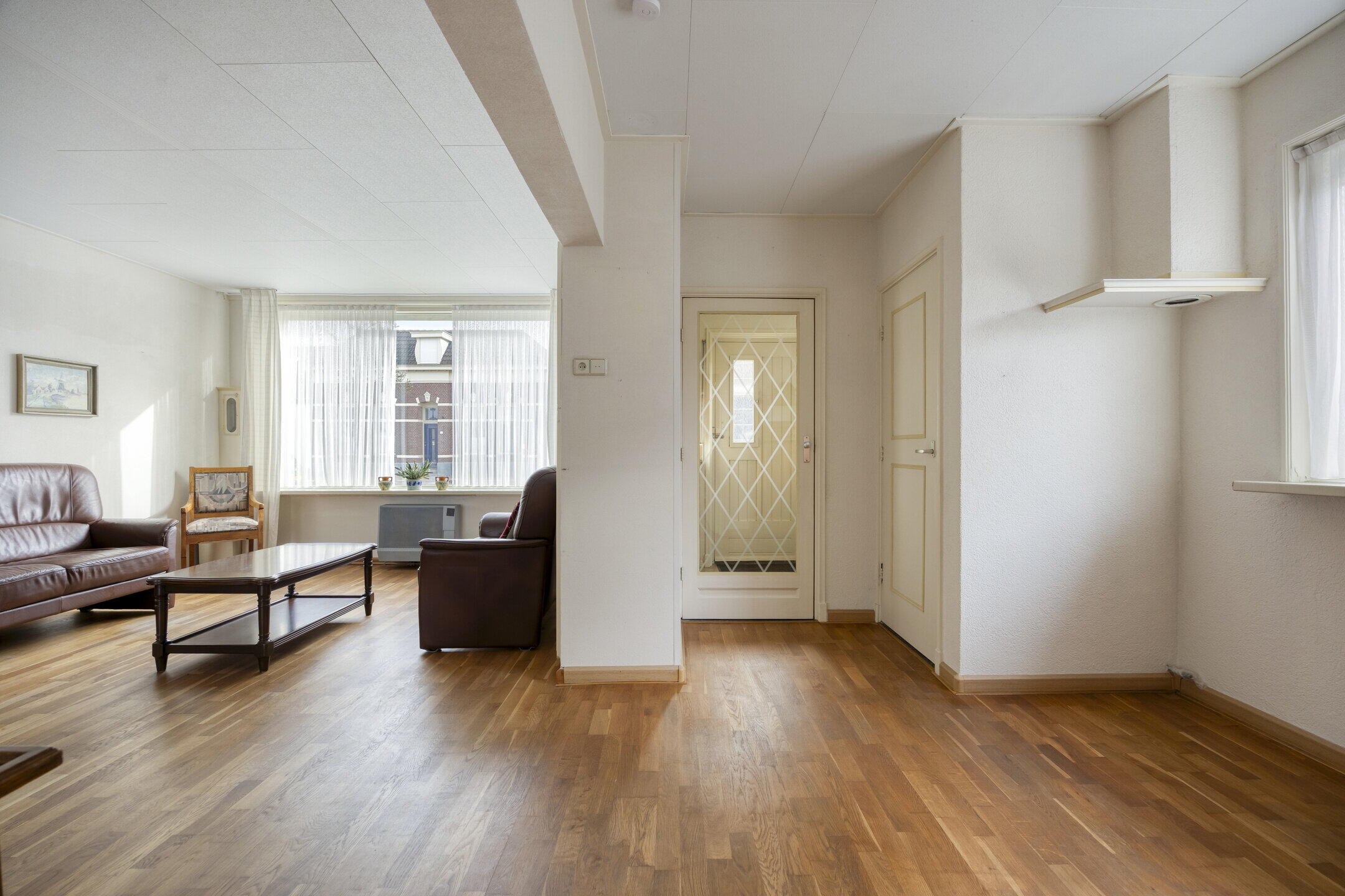 Bij binnenkomst valt direct op hoeveel ruimte de woning biedt. Links bevindt zich een handige provisieruimte voor extra opslag. De woonkamer is royaal en biedt volop mogelijkheden voor het creëren van een gezellige zithoek. Dankzij de grote ramen met glas-in-looddetails komt er veel natuurlijk licht binnen en krijgt de ruimte een sfeervolle en karaktervolle uitstraling. Via schuifdeuren bereik je de ruime keuken. Dit is een fijne plek waar je nog alle kanten mee op kunt. De keuken is netjes en ruim genoeg om hier ook een grote eettafel te plaatsen, zodat je hier heerlijk kunt dineren met familie en vrienden. Aansluitend vind je een kleine serre, wat zorgt voor extra licht en een fijne overgang naar buiten. Naast de keuken bevindt zich een praktische bijkeuken, ideaal voor het opbergen van spullen. Vanuit hier bereik je ook een gang met een separaat toilet.