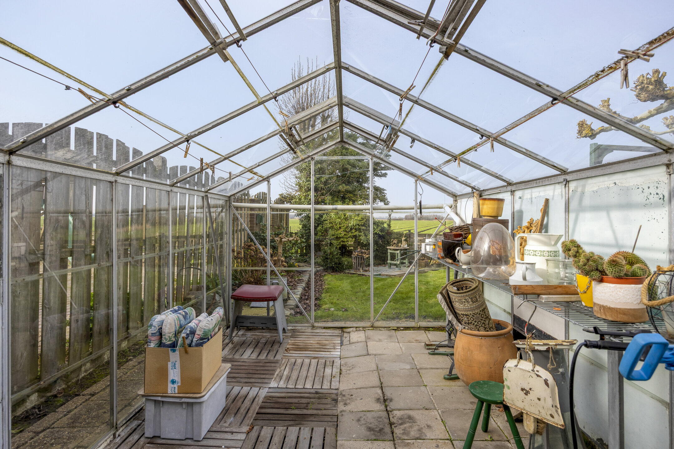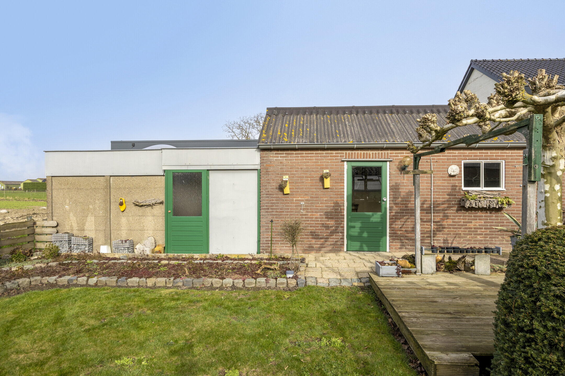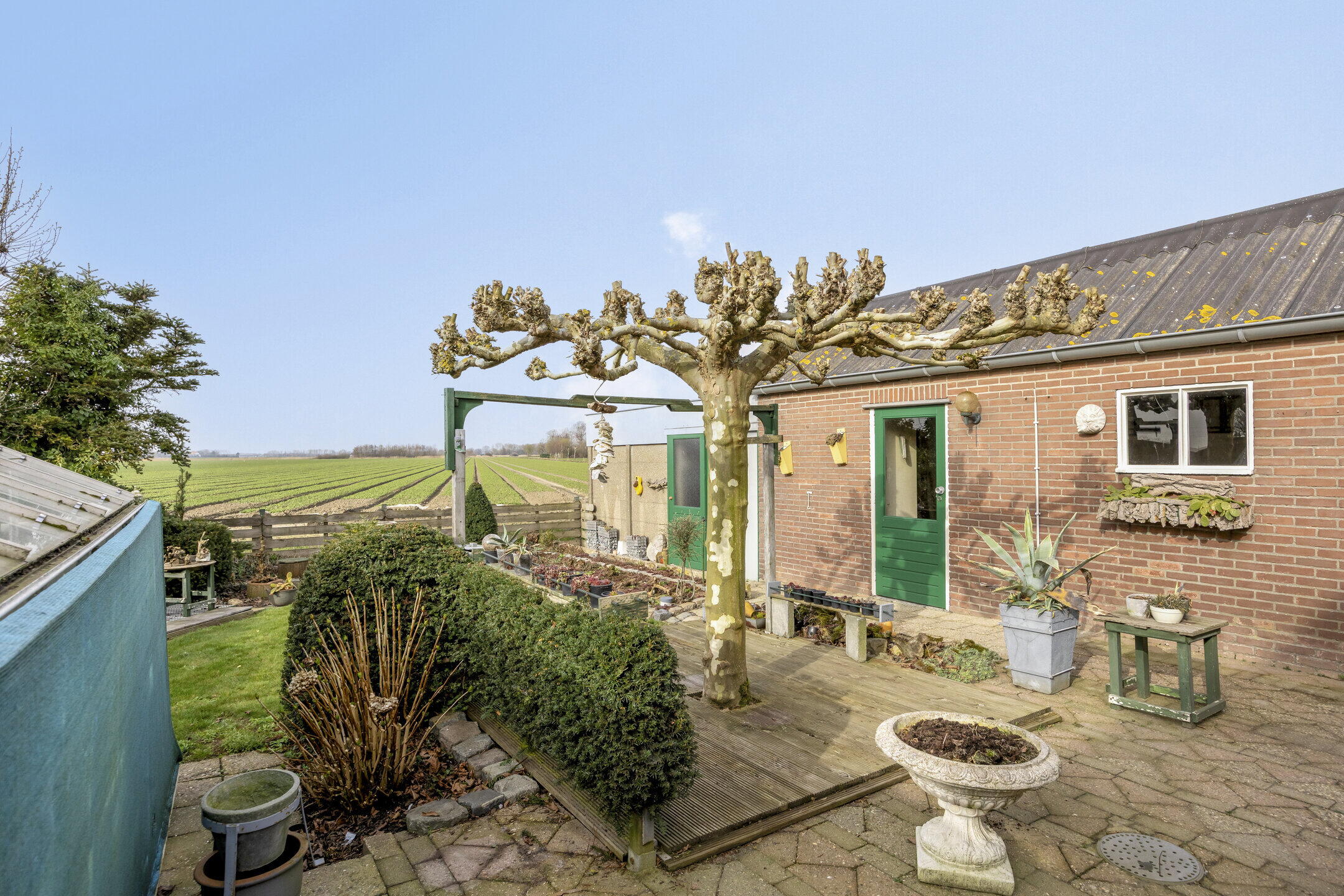 De achtertuin is een echte verrassing. Deze is zeer ruim en biedt tal van mogelijkheden voor tuinliefhebbers, hobbyisten of gezinnen die graag buiten zijn. Je kijkt uit over de uitgestrekte weilanden, waardoor je hier geniet van rust, privacy en een prachtig vrij uitzicht. De tuin is deels bestraat en deels voorzien van gras en beplanting, wat zorgt voor een fijne balans tussen onderhoudsgemak en groen. Daarnaast beschikt de tuin over een eigen kas en twee bergingen. Aan de woning bevindt zich bovendien een grote garage met aangrenzende berging. Deze ruimte is perfect te gebruiken als opslag, hobbyruimte of zelfs als werkplaats aan huis.